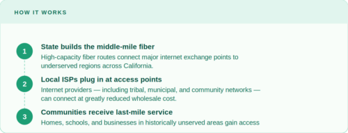 California’s middle-mile network — built under the California Department of Technology’s infrastructure mandate — is slated to ultimately reach tens of thousands of miles across the state, threading through rural valleys, mountain communities, tribal lands, and agricultural regions that private carriers have historically passed over.